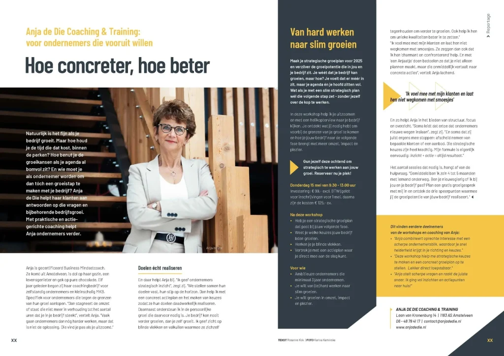 Anja de Die helpt haar klanten aan antwoorden op die vragen en bijbehorende bedrijfsgroei. Met praktische en actie- gerichte coaching helpt Anja ondernemers verder.